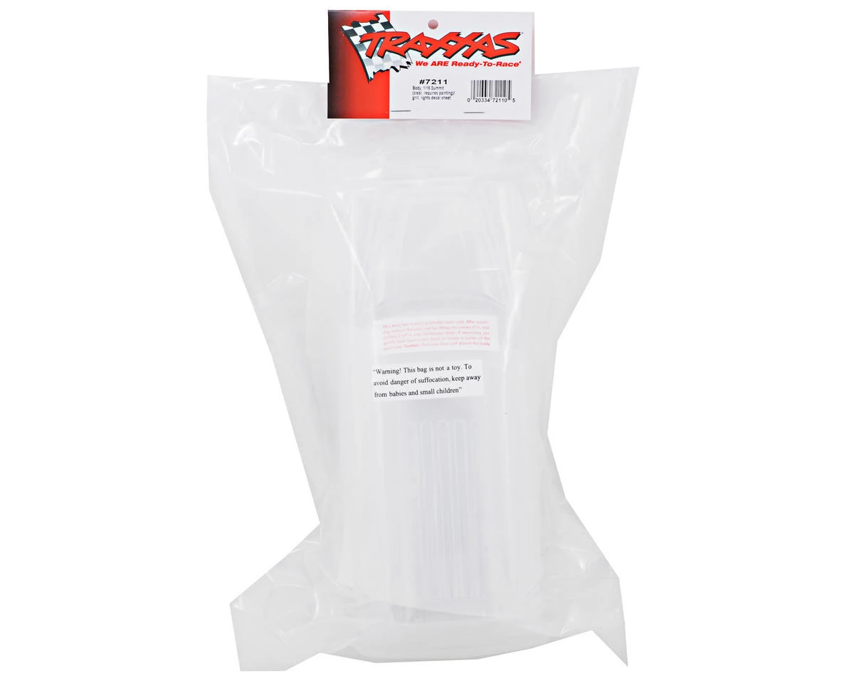 This is a replacement Traxxas Clear Body with Decal Sheet, and is intended for use with the Traxxas 1/16 Summit.