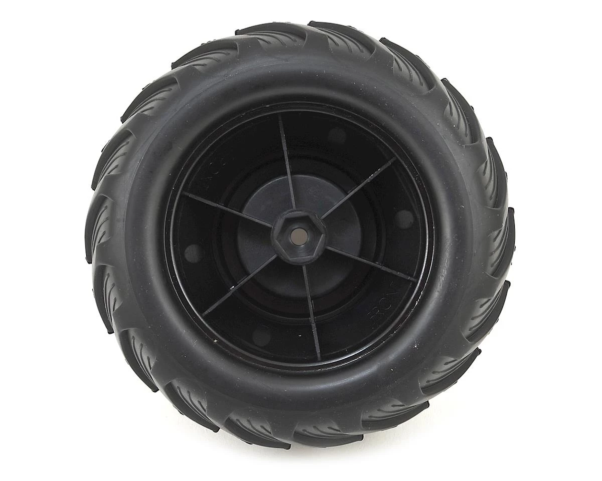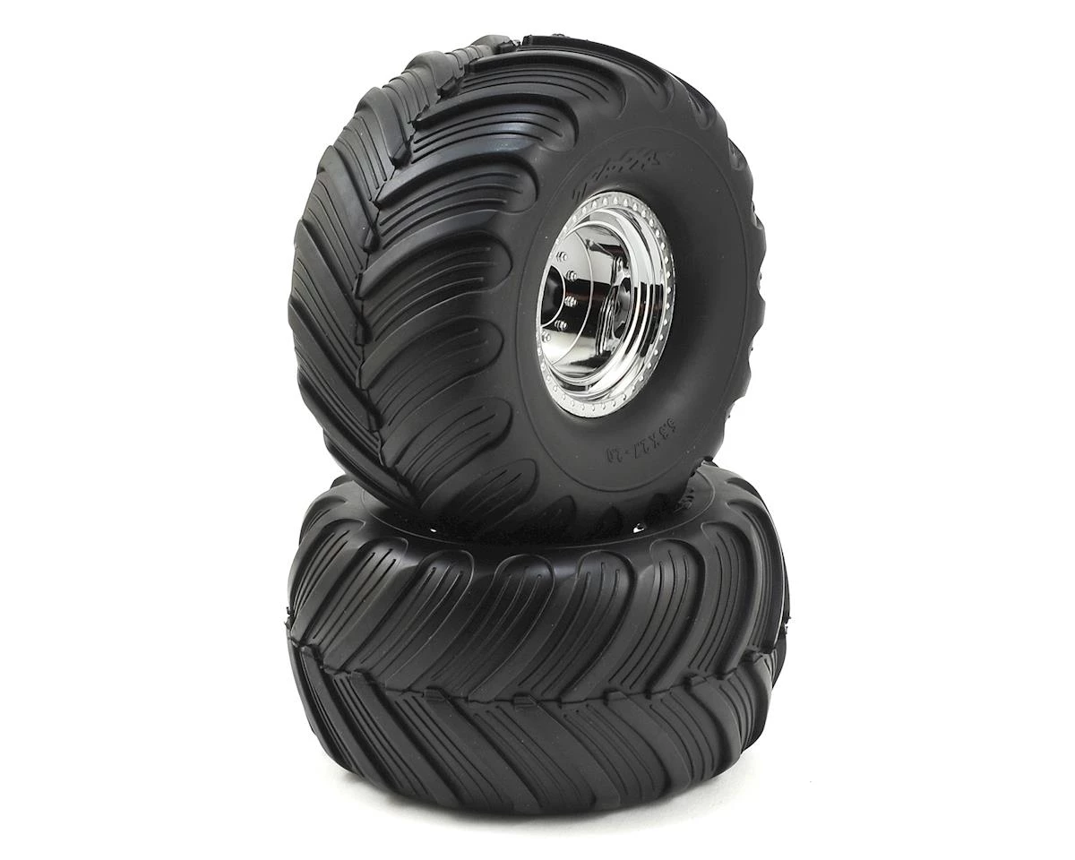 This is a pair of replacement Traxxas “Bigfoot” Pre-Mounted Tires & Wheels. These tires and wheels are assembled and glued, with a satin chrome wheel finish, Terra Groove dual profile tires and foam inserts. These wheels are compatible on the front of the electric Stampede platform.