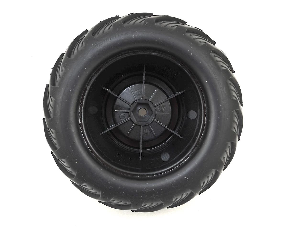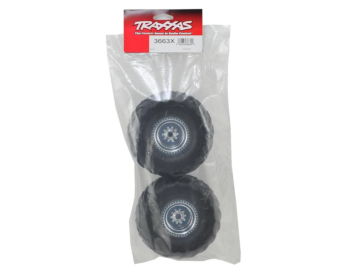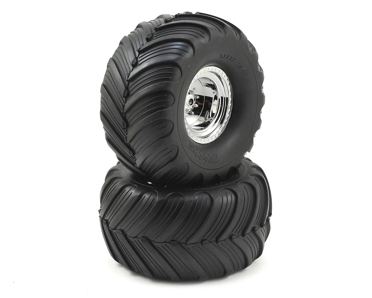 This is a pair of replacement Traxxas “Bigfoot” Pre-Mounted Tires & Wheels. These tires and wheels are assembled and glued, with a satin chrome wheel finish, Terra Groove dual profile tires and foam inserts. These wheels are compatible on the rear of the electric Stampede platform.