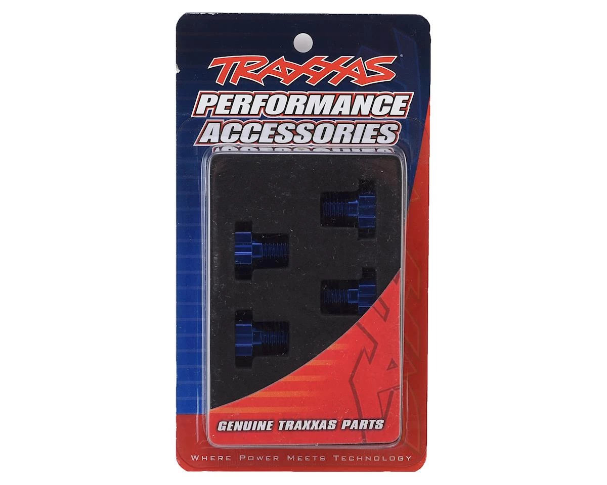 This is a pack of two replacement Traxxas 17mm Splined Wheel Hub Hexes, in Blue anodize. Also included are four 4x5mm set screws and four 3x14mm pins.