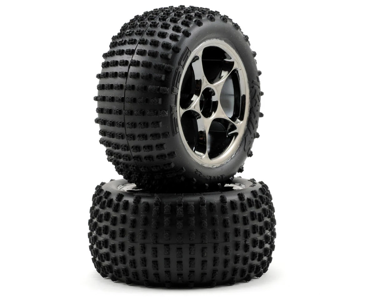 This is a set of two Traxxas Rear Alias Tires, pre-mounted on Tracer 2.2″ Wheels, and are intended for use with the Traxxas Bandit. Whether racing on a track or tearing across a back lot, Alias tires are the perfect choice. The Alias features a non-directional design for no-hassle, no-worry mounting. The Alias rear tires integrate a rounded carcass and dual pin design that steps-up to keep the tires firmly planted on extreme off-road terrain. This tire combination is ideal for use on grass, loamy dirt, sand, and any other loose surface. The Alias tire is molded in a super soft rubber compound that supplies exceptional grip on asphalt and other hard packed surfaces. The Alias is a versatile tire that is at home on the track or in the backyard. Choose from Chrome, or Black Chrome Tracer wheels.