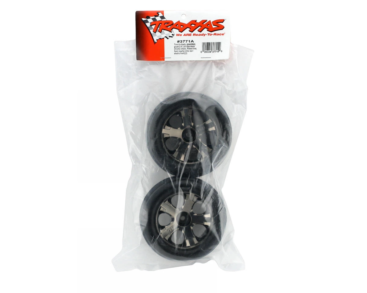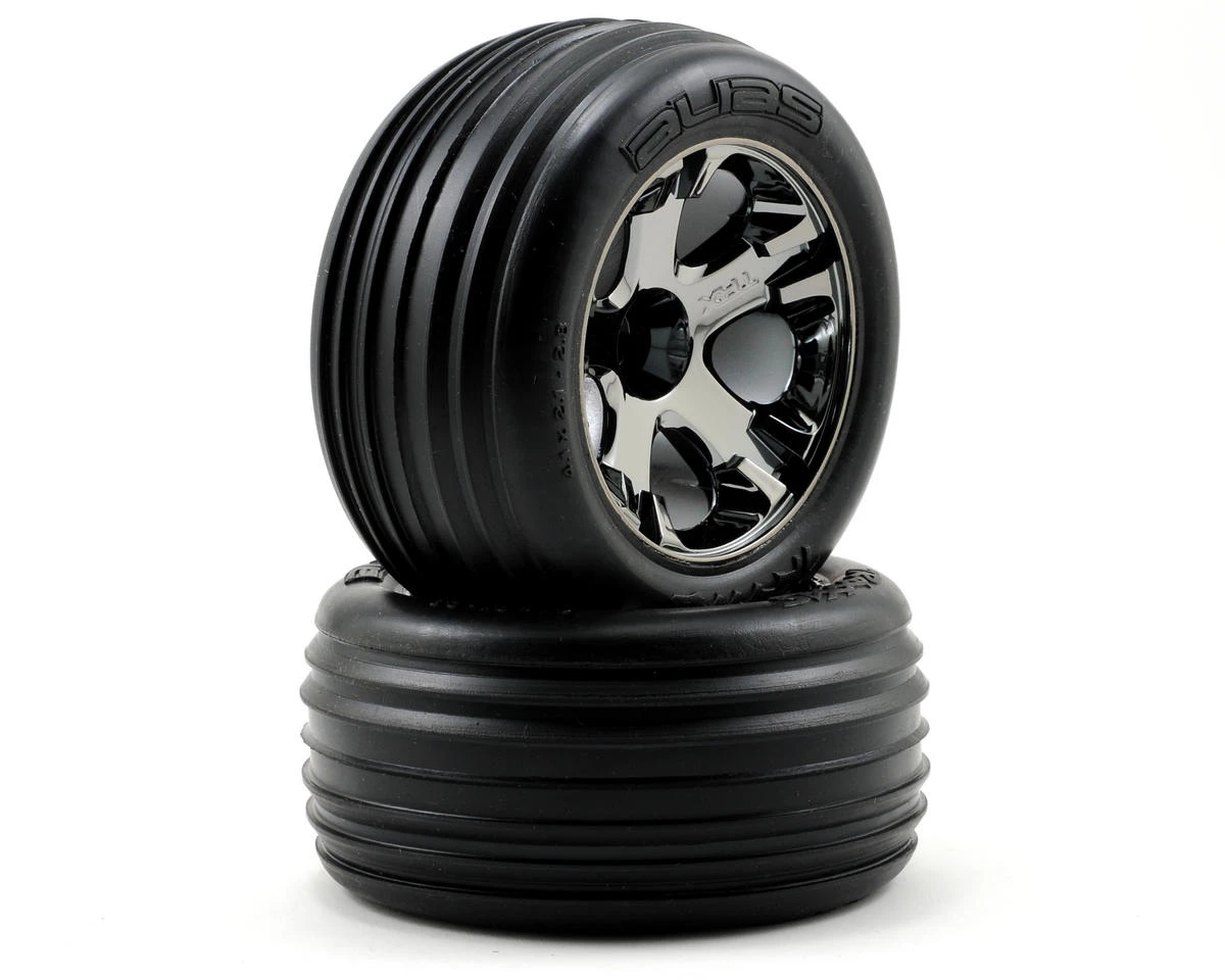 This is a set of two premounted Traxxas Alias Front tires, mounted on All Star Wheels. Choose from Black Chrome or Chrome finish wheels.
