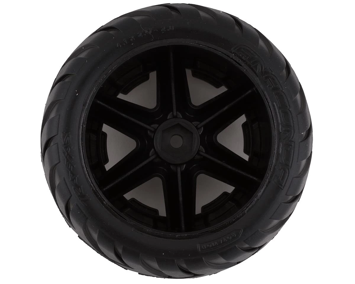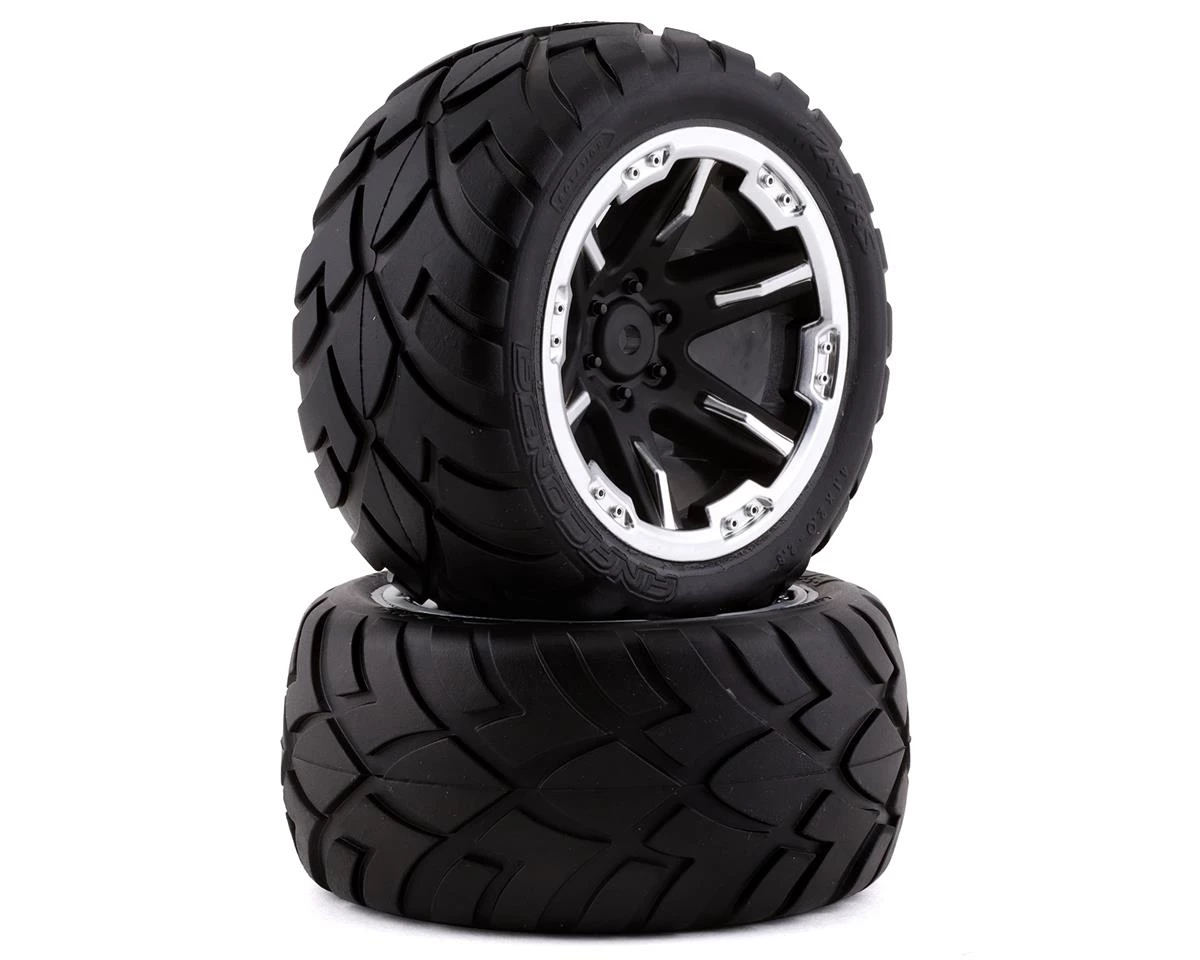 Traxxas Anaconda 2.8″ Pre-Mounted Tires w/RXT Electric Rear Wheels. Anaconda performance street tires feature a specially formulated tire compound providing a long lasting traction. These tires are mounted and pre-glued on tough RXT black chrome wheels. Molded-foam inserts coupled with the directional tread design provide a balanced feel for the ultimate high-speed on-road experience. These optional pre-mounts are intended for the rear of the Traxxas Rustler 2WD. Package includes two pre-mounted tires.