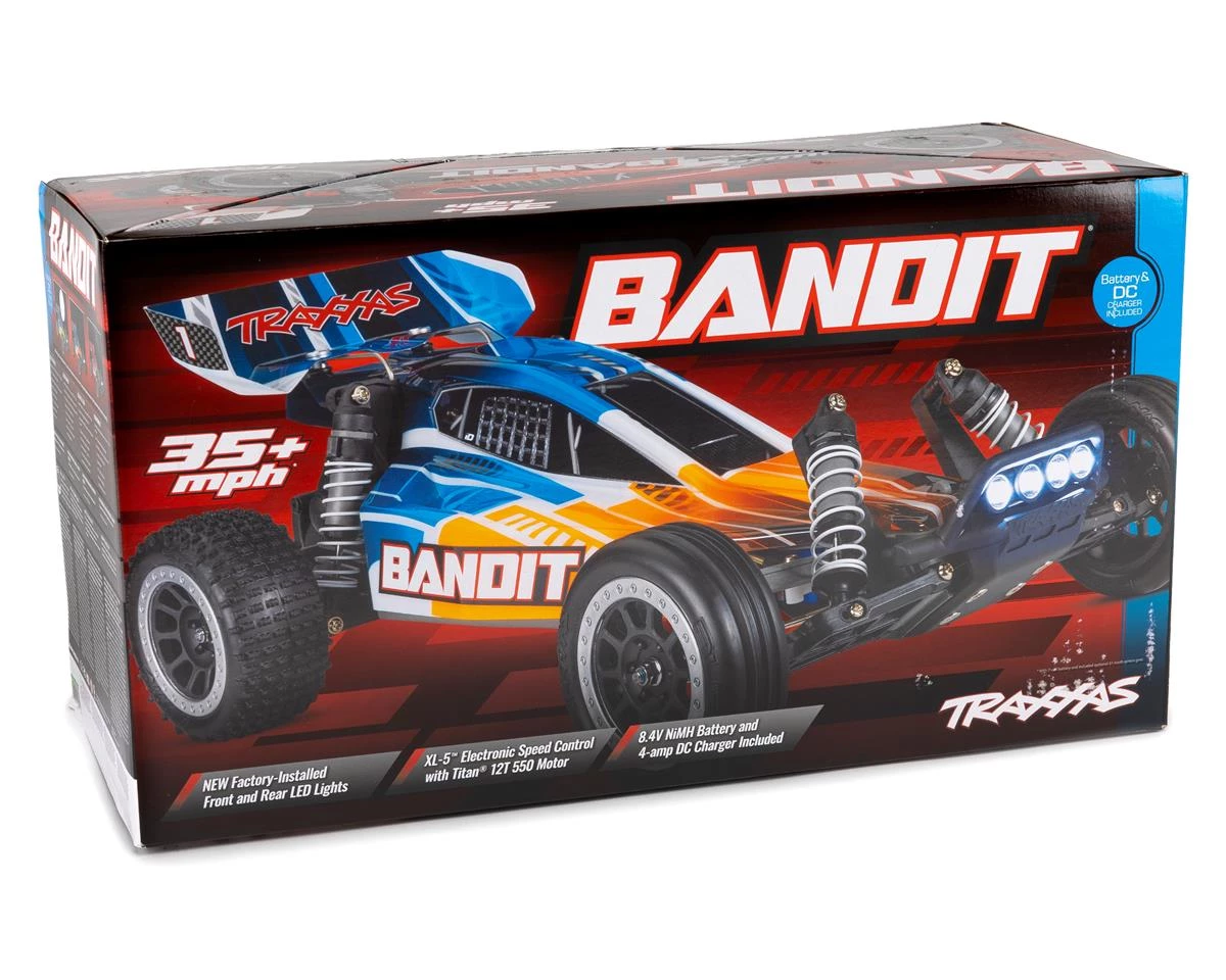 The Traxxas Bandit 1/10 Ready-to-Run 2WD Electric Buggy with LED Lights is designed to deliver great buggy performance with sleek styling. At its core, the Bandit features a light weight chassis with independent suspension front and rear. The exterior of this bandit includes four LED front pod lights and two rear brake lights. A Titan 550 motor powers the brushless-ready Magnum 272 transmission. With the Traxxas Bandit’s fully waterproof electronics, even the wildest all-weather adventures are possible. The Bandit comes ready-to-run out of the box and comes with a Traxxas TQ 2.4GHz transmitter, XL-5 ESC, 8.4V NiMH battery and a DC charger.