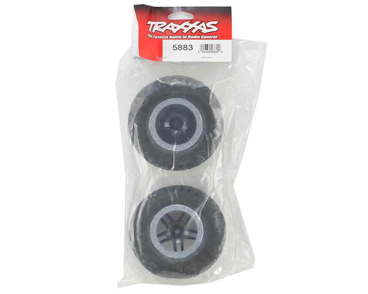 This is a set of two Traxxas BFGoodrich Mud-Terrain T/A KM2 Tires, Pre-Mounted on Split-Spoke SCT Wheels. These are intended for use on the front and rear of the Traxxas Slash 4×4 and the rear of the Traxxas Slash 2wd line of trucks. These are fully licensed BFGoodrich Mud-Terrain T/A tires, and have been proven performers in TORC series competition. The distinctive tread design has been faithfully re-created, complete with white sidewall lettering.