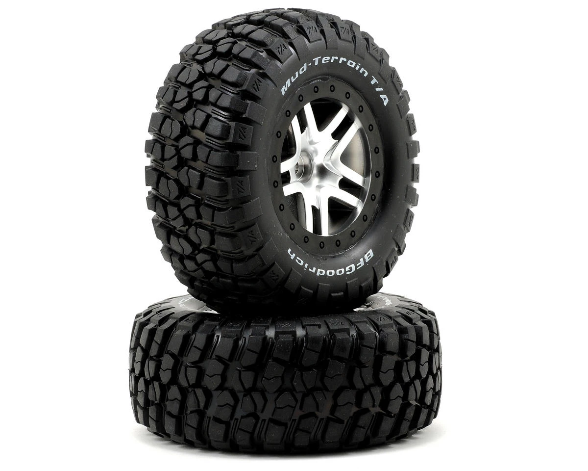 This is a set of two Traxxas BFGoodrich Mud-Terrain TA Tires, Pre-Mounted on SCT Split-Spoke Wheels. These are intended for use on the front of the Traxxas Slash 2wd trucks. These are the fully licensed BFGoodrich Mud-Terrain T/A tires, and have been proven performers in TORC series competition. The distinctive tread design has been faithfully re-created in high grip rubber, complete with white sidewall lettering. Available in standard “hard” and race proven “S1” soft compounds to suit a variety of conditions. Standard compound is a long wearing rubber blend that will stand up to abuse on concrete and pavement, while S1 compound delivers precise steering and incredible grip on the front of the 2WD Slash.