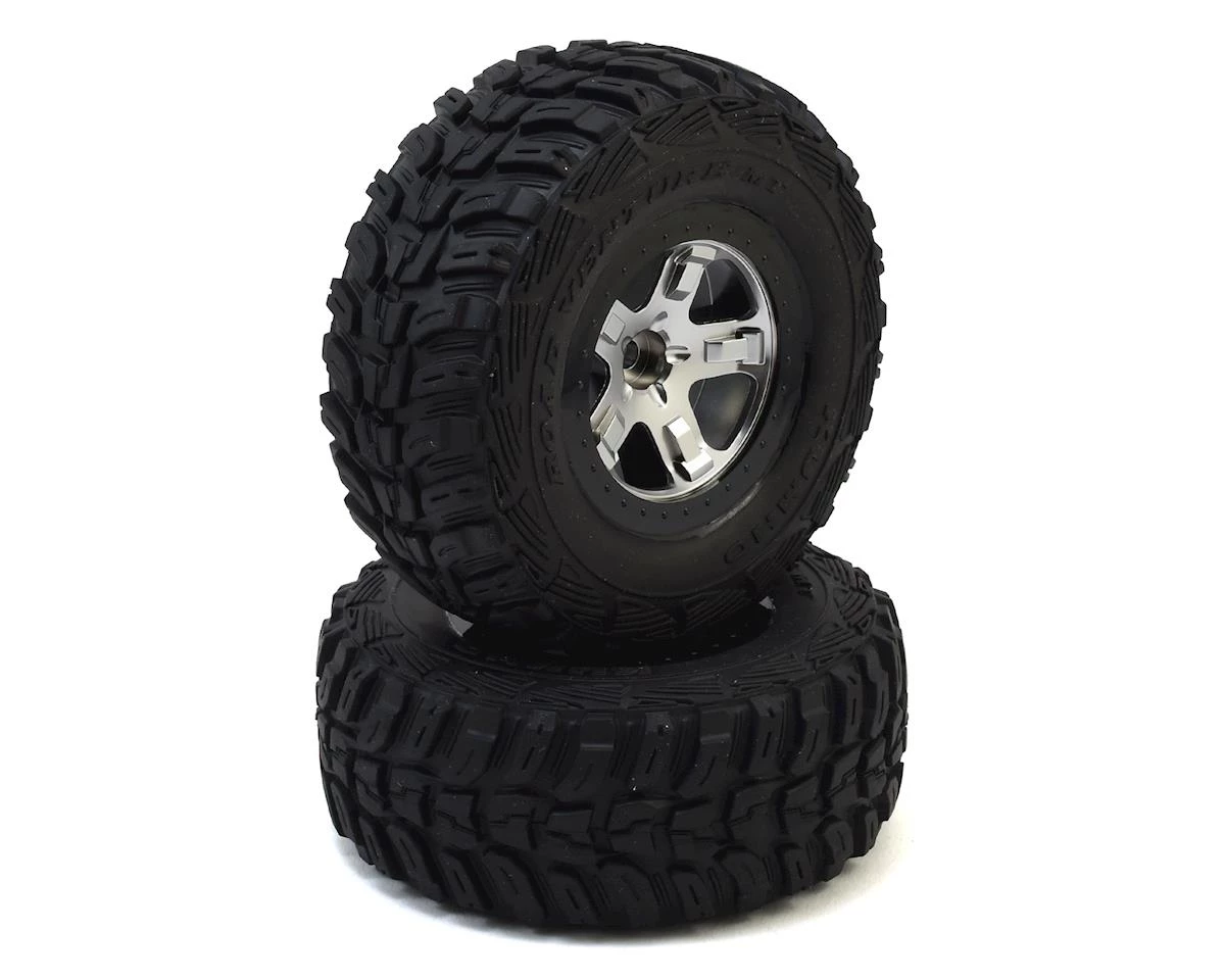 This is a set of two Traxxas Standard Compound Kumho Venture MT Tires, Pre-Mounted on SCT Split-Spoke Wheels. This tire set is intended for use on the front of the Traxxas Slash. The race-winning Kumho Road Venture MT tire is the latest competition-proven tread pattern to be captured in 1/10 scale by Traxxas. The distinctive design is realistically molded in the long lasting, versatile standard compound, with unique, aggressive sidewall detail and raised lettering that have been perfectly rendered for realistic looks and authentic performance.