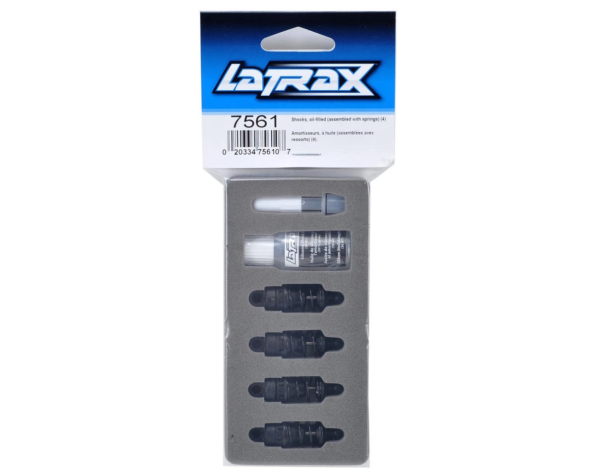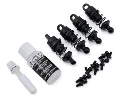 This is an optional LaTrax Oil Filled Shock Set. These shocks feature the ability to hold oil for improved performance. This allows the user to tune the suspension with different oil weights, providing an increased level of tuning options. Package includes four pre-built shocks, eight shock mount ball studs, and a bottle of LaTrax 30wt shock oil.