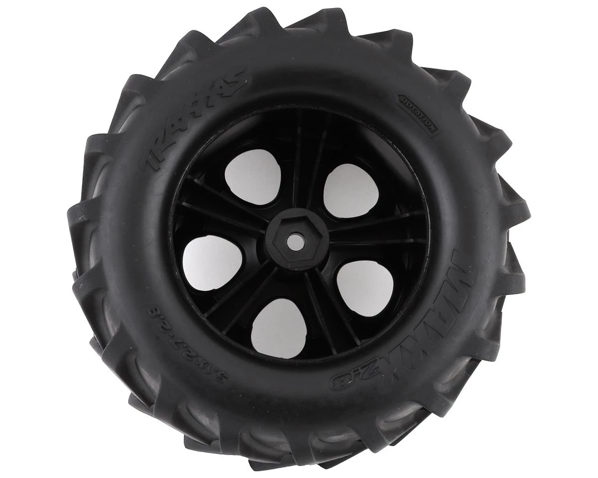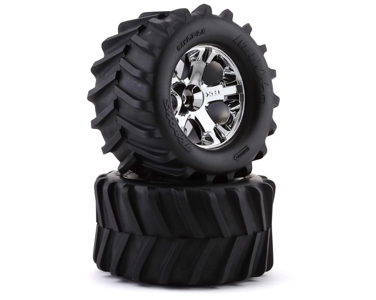 Traxxas Maxx 2.8″ Pre-Mounted Tires w/All-Star Wheels. These tires feature a 12mm hex, chevron style tread and are a replacement for the Stampede 4×4, however, they will also work for the Traxxas Hoss 4×4, Rustler 4×4 and the Bigfoot No. 1. Package includes two pre-mounted tires.