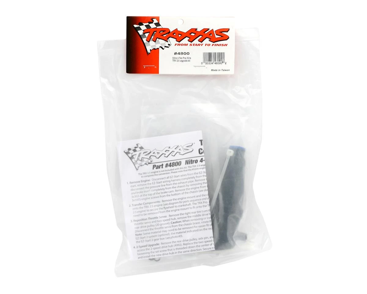 This is the Pro .15 to TRX 2.5 engine conversion for the Traxxas Nitro 4-TEC. COMMENTS: If EZ-Start system is needed, use TRAP5271 Removal of material from the engine mount will be needed. This proceedure is illustrated on the instruction sheet. NNA 5/19/03 ir/jxs