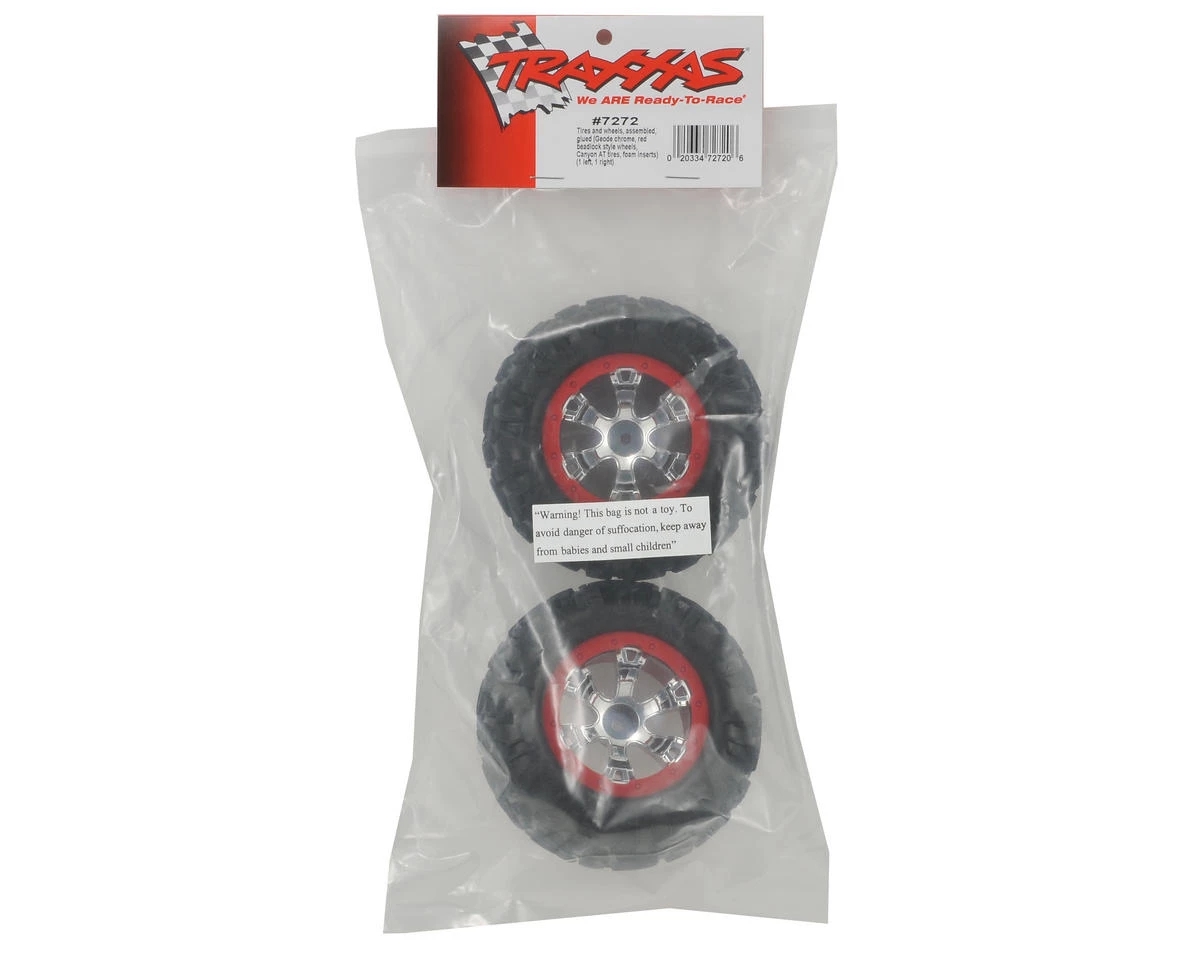 This is a set of two Traxxas Canyon AT Tires, Pre-Mounted on GeodeBeadlock Style Wheels, and are intended for use with the Traxxas 1/16Summit. Canyon AT tires on beadlock-style Geode wheels provide a ruggedlook that’s backed up by the Summit VXL’s excitingall-terrain performance.
