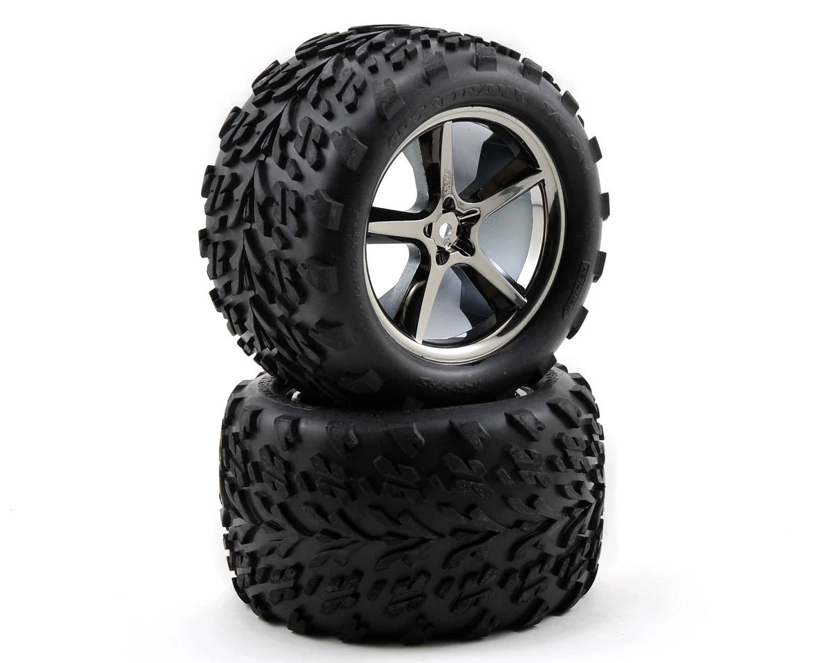 This is a set of two Traxxas Talon Tires Pre-Mounted on Black Chrome Gemini Wheels, and are intended for use with the Traxxas Revo, and Maxx trucks with 14mm hex hubs. The wide, low profile tread design provides excellent handling and reduced weight. The diameter is the same as a stock Maxx tire, but the larger 3.8″ wheel diameter provides responsive handling with a low profile sidewall. Pre-glued with installed foam inserts. Soft compound rubber. Compatible with the Maxx family. Chrome Split-Spoke rims.
