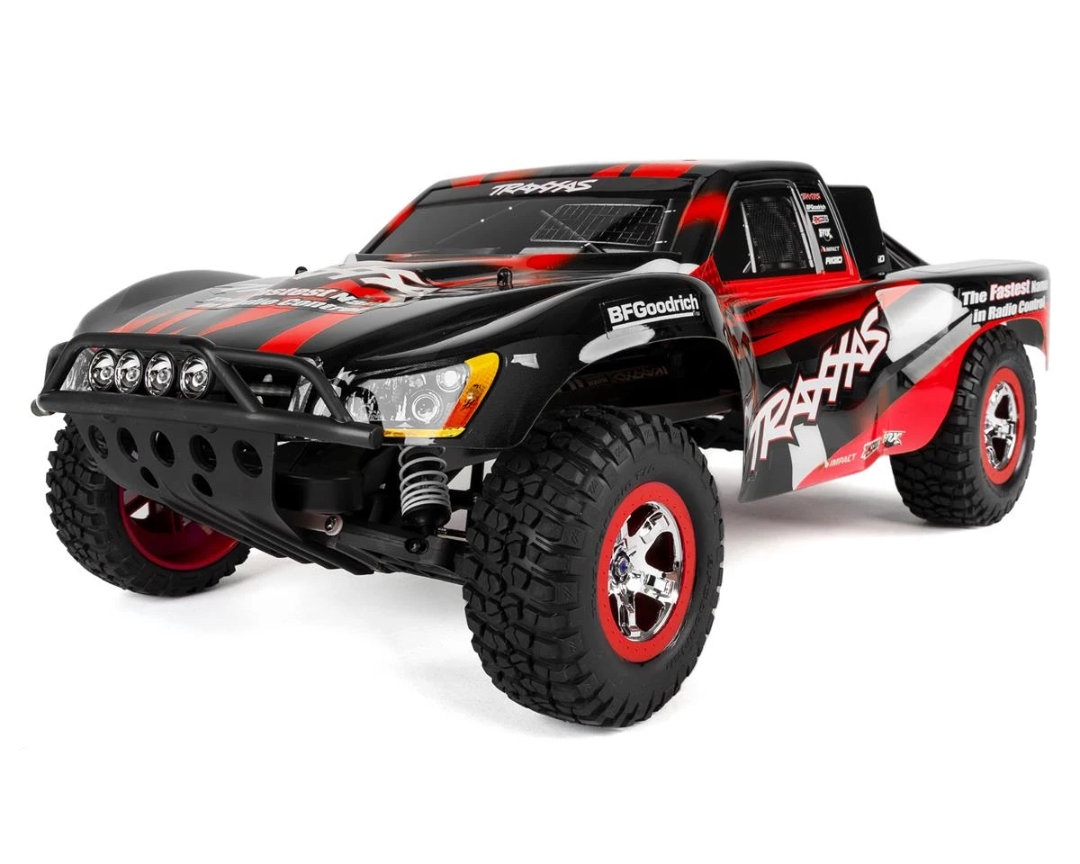 The Traxxas Slash 1/10 RTR Short Course Truck is has been designed for durability, performance and fun. Outfitted with the powerful Titan 12T 550 motor and bulletproof reliability of the XL-5 electronic speed control, the Slash takes on any high-flying, fender-banging, adventure you can throw at it. Waterproof electronics keep the fun going through wet weather conditions and LED lighting extends your driving fun after dark. Grab your transmitter and get ready for dirt roosting power slides.