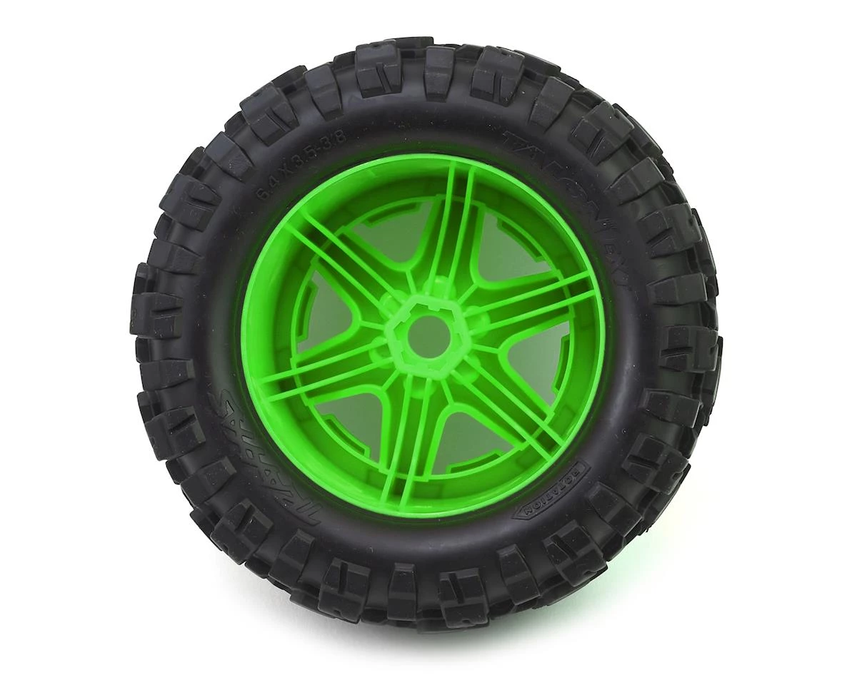 This is a pack of two Traxxas Talon EXT Tires 3.8″ Monster Truck Tires, Pre-Mounted to Green Traxxas Wheels. This is the same tire and wheel combo that comes equipped with the E-Revo VXL 2.0, but with the optional Green colored wheel.