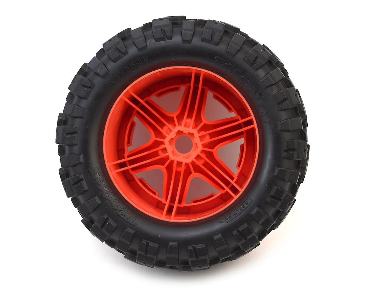This is a pack of two Traxxas Talon EXT Tires 3.8″ Monster Truck Tires, Pre-Mounted to Orange Traxxas Wheels. This is the same tire and wheel combo that comes equipped with the E-Revo VXL 2.0, but with the optional orange colored wheel.