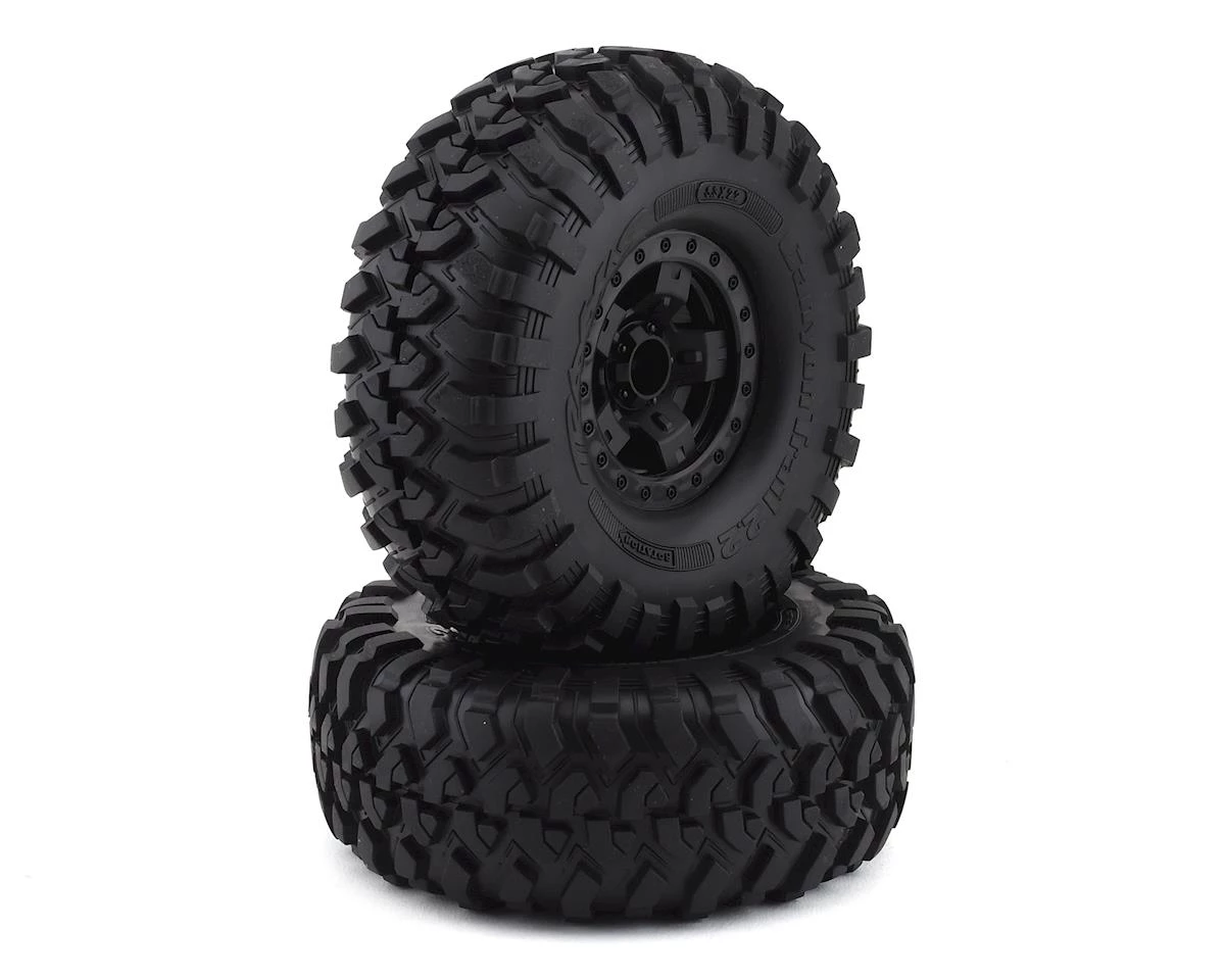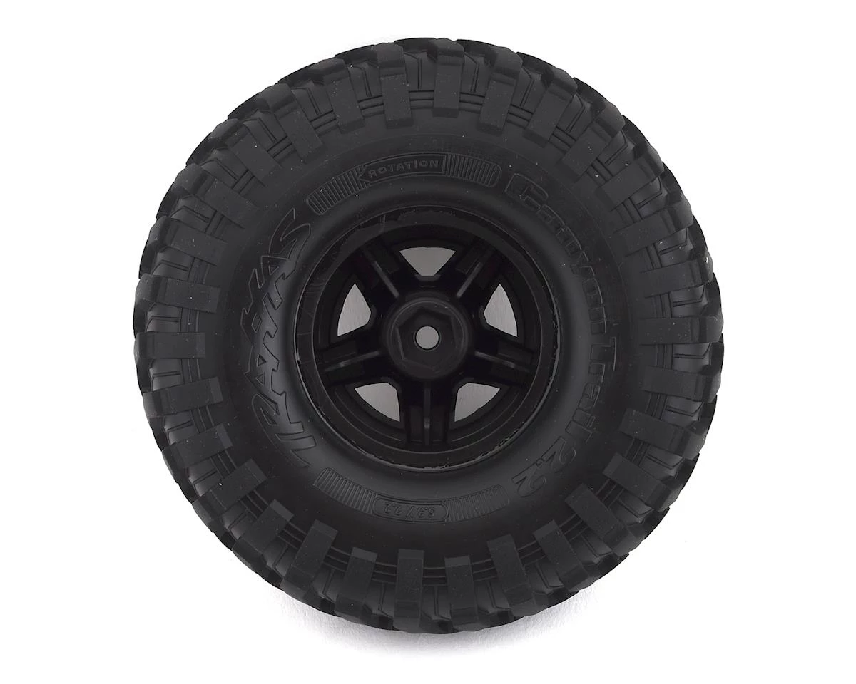 The Traxxas TRX-4 Pre-Mounted Canyon Trail 2.2″ Crawler Tires w/Sport Wheels. The 2.2 Canyon Trail tires and tuned foam inserts are super-soft and grippy to deliver superior bite on rocky surfaces with convincing scale realism. This package contains two premounted tires on black TRX-4 Sport wheels.