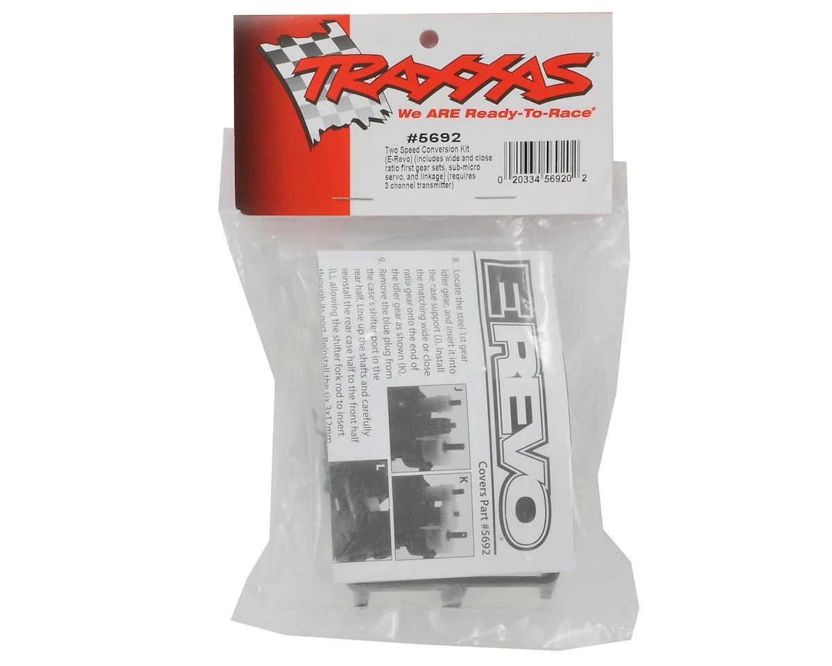 This is an optional Traxxas Two Speed Conversion Kit, and is intended for use with the Traxxas E-Revo. In stock trim, the E-Revo (#5605) is equipped with a Brushless Ready single speed transmission that is optimized for all-around running. The optional Two-Speed Conversion Kit offers another dimension of versatility and performance for E-Revo owners who want the option of stump-pulling torque and high-speed passes. The included waterproof sub-micro servo actuates the internal shift fork with the push of a button from a three channel transmitter (sold separately).