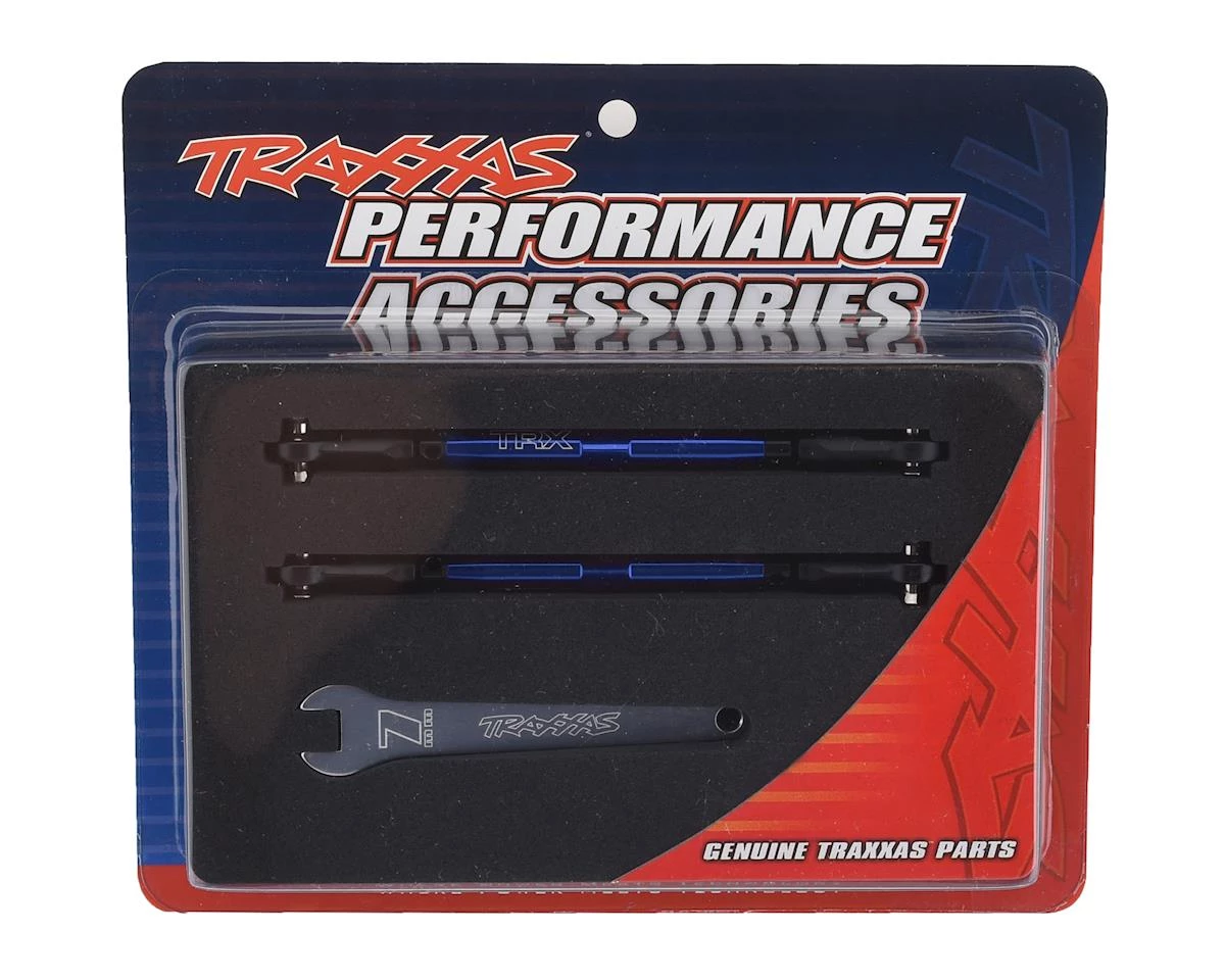 Traxxas Unlimited Desert Racer Aluminum Front Toe Links in Blue are an optional upgrade that is 30% lighter than the stock steel toe links, plus they’re 4-times stiffer with more than double the strength of aftermarket titanium! Traxxas toe links are manufactured from high-grade 7075-T6, and anodized blue. Package contains two assembled with rod ends, hollow balls and one aluminum 7mm wrench.