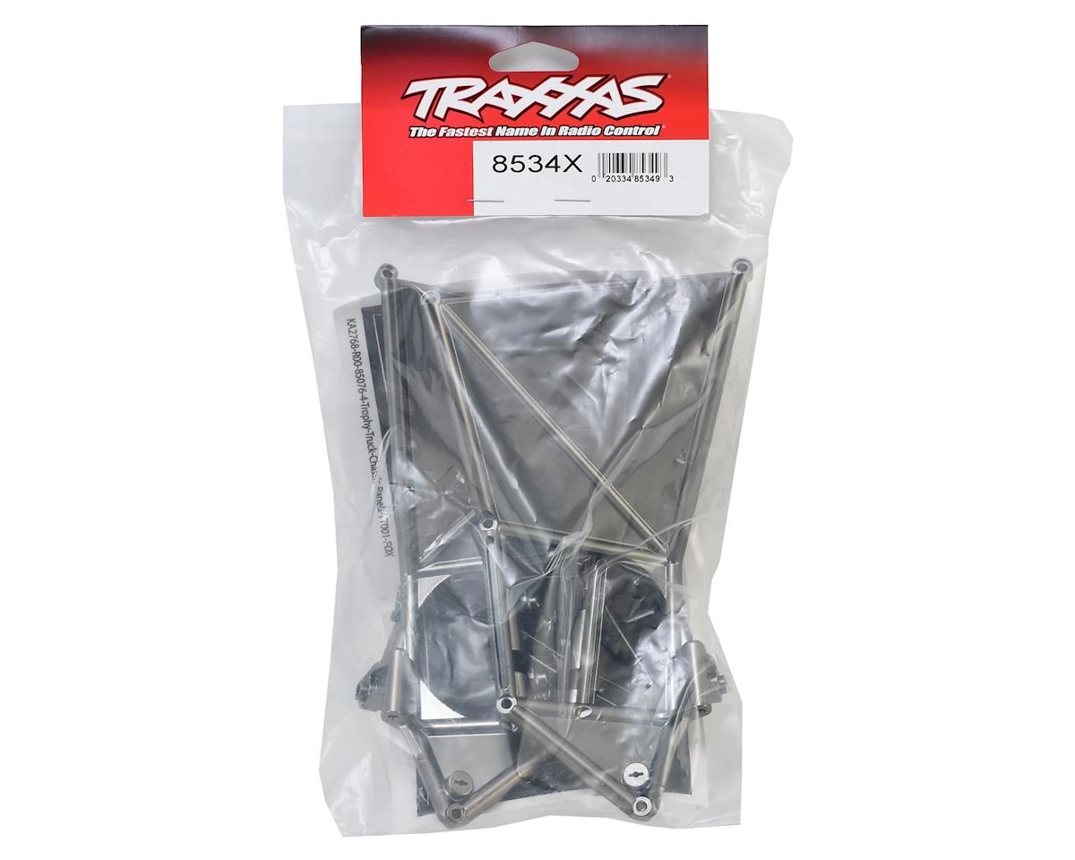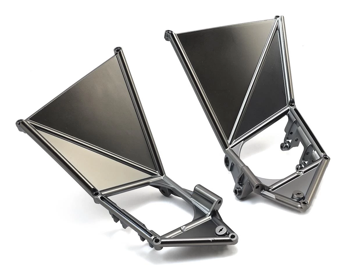 This is the optional Traxxas Unlimited Desert Racer Front Suspension Arm Mount Set in Chrome Plated Black Satin. This set includes one left and one right side mount, as well as decals.
