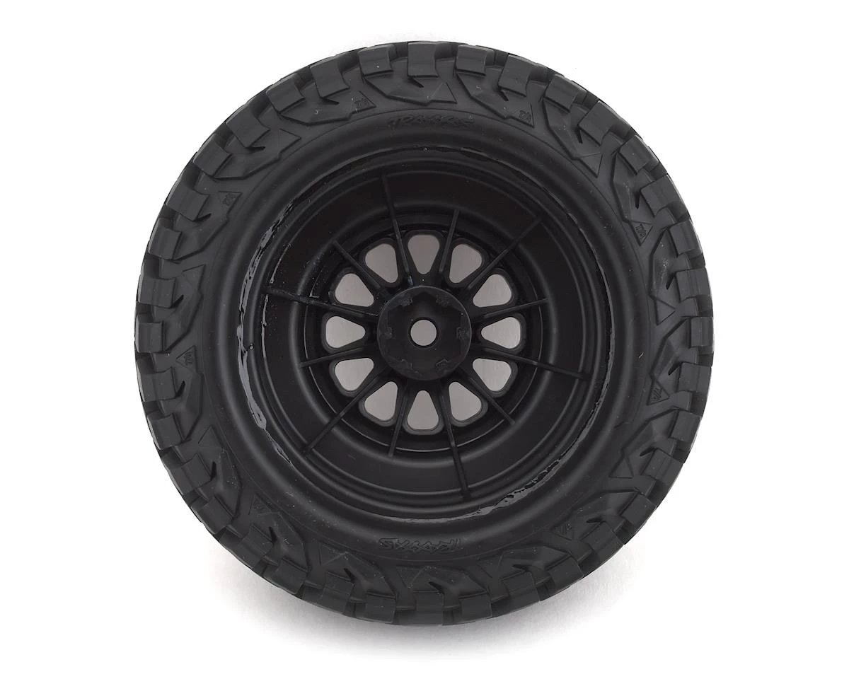 This is a set of two Traxxas Unlimited Desert Racer Premounted BFGoodrich Baja KR3 Tires. These are an excellent choice for use on the Unlimited Desert Racer, and are made with Traxxas standard compound. These are fully licensed replicas of the BFGoodrich Mud-Terrain T/A tires, and have been proven performers in full size TORC series racing competition. The distinctive tread design has been faithfully re-created in high grip rubber, complete with sidewall lettering. Package contains two premounted tires and two black split spoke wheels with red beadlock ring and a realistic design.