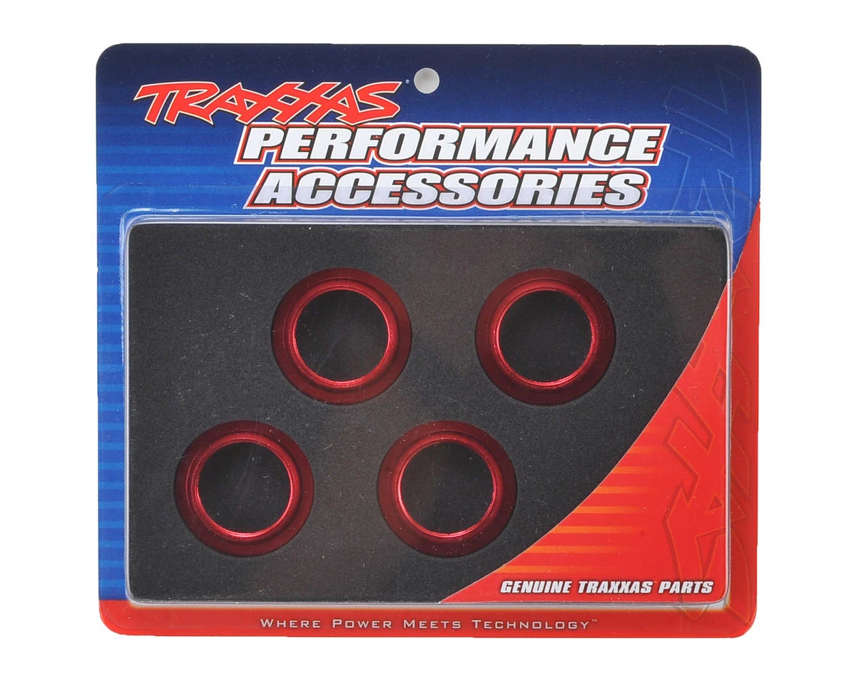 This is a pack of four optional Traxxas Aluminum GTX Threaded Collars for the Traxxas X-Maxx. These red-anodized, PTFE-coated aluminum upper spring retainers are equipped with integrated o-rings for precise spring pre-load adjustments.