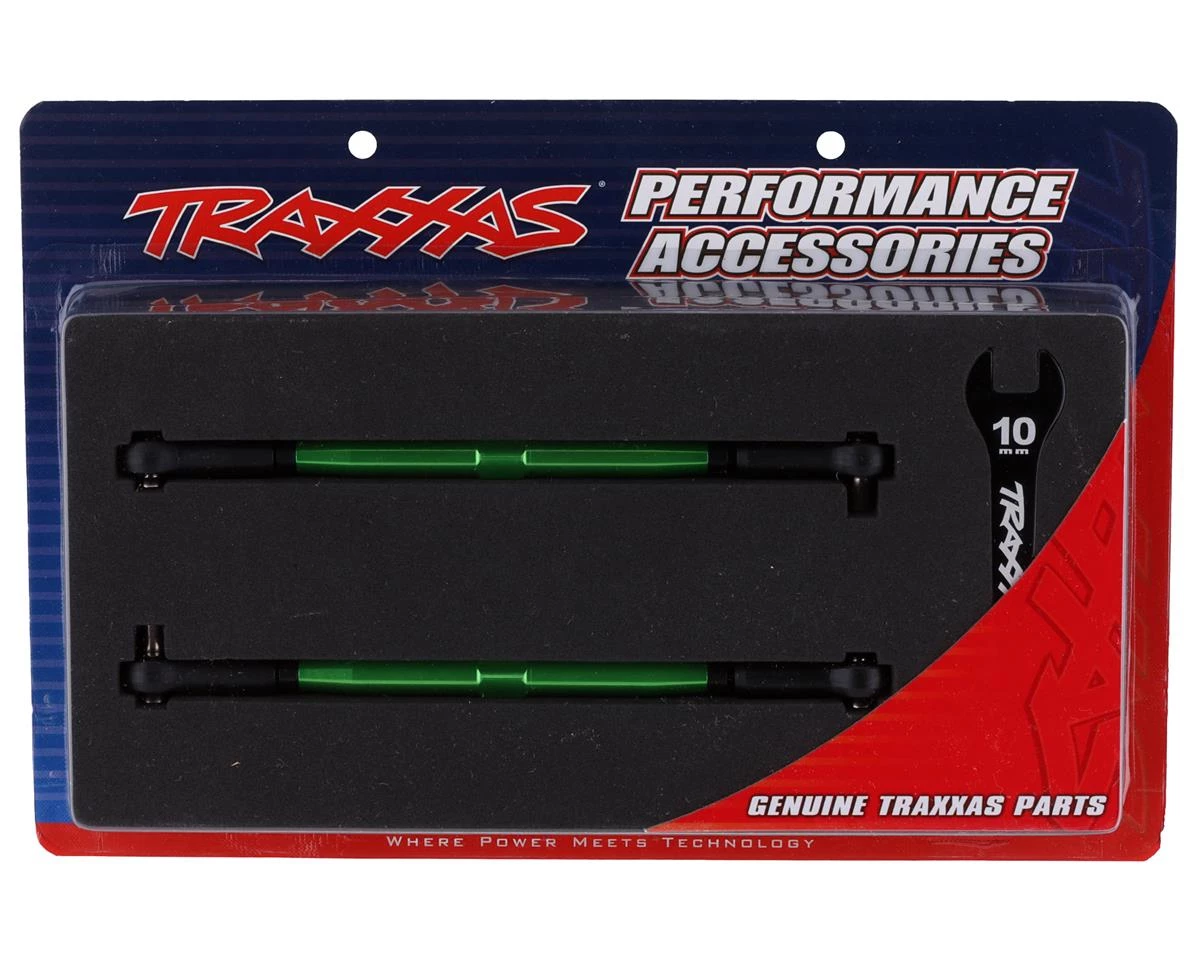 Traxxas X-Maxx Aluminum Toe Links. These optional toe links are made from aluminum to be lighter than steel while maintaining rigidity. Using a hollow tube design, these feature grooves to identify the left hand threads for easy adjustments. Package includes two toe links.
