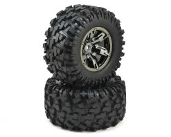 This is a pack of two Traxxas X-Maxx Tires, Pre-Mounted on Black Chrome Wheels. These massive X-Maxx tires are pre-glued to X-Maxx wheels, with included foam inserts. For use on the front or rear, left or right.