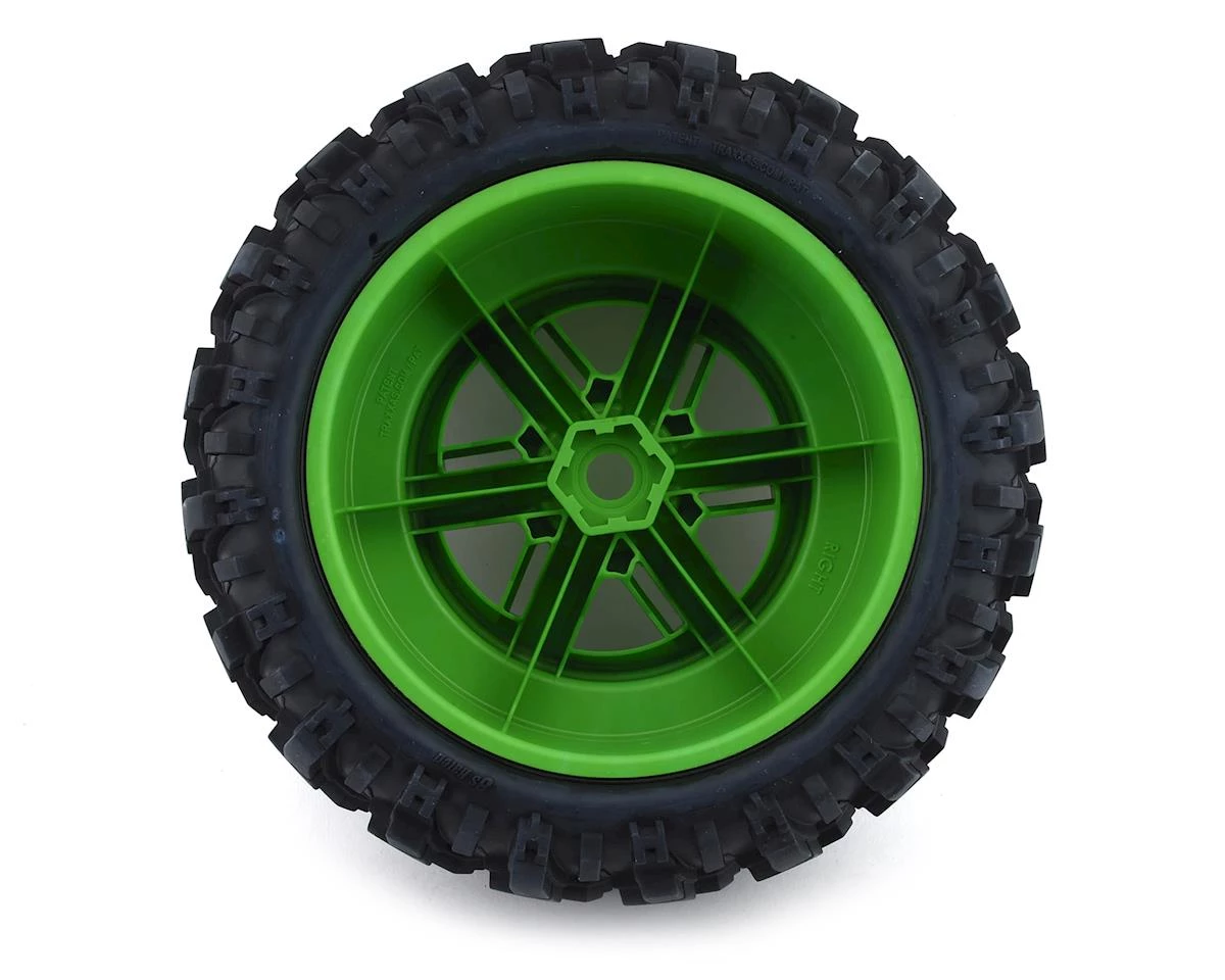 This is a pack of two Traxxas X-Maxx Tires, Pre-Mounted on Green Wheels. These massive X-Maxx tires are pre-glued to X-Maxx wheels, with included foam inserts. For use on the front or rear, left or right.